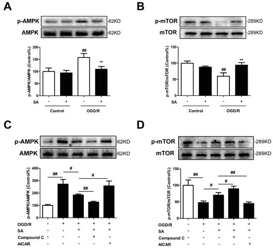 SA modulated AMPK/mTOR pathway proteins in PC12 cells. PC12 cells were pretreated with SA and exposed to OGD/R. The expression of phosphorylation of AMPK (A) and mTOR (B) was detected by Western blot (n = 3). All data are mean ± SD. ## P < 0.01 vs. control group; ** P < 0.01 vs. model group. PC12 cells were treated with SA (10 μM) and 1 μM compound C or 1 mM AICAR and then exposed to OGD/R. The expression of phosphorylation of AMPK (C) and mTOR (D) was detected by Western blot (n = 3). All data are mean ± SD. # P < 0.05 and ## P < 0.01.