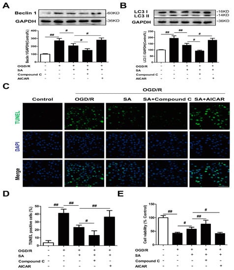 Subsequently, we investigated the effects of the activation of the AMPK/mTOR pathway on the SA-mediated suppression of autophagy under OGD/R. Data revealed that activation of the AMPK/mTOR pathway by AICAR treatment significantly abolished the SA-mediated autophagy suppression, as evidenced by an increase in Beclin 1 (Figure 6A) and LC3-II (Figure 6B) protein expression plus TUNEL positive cells (Figure 6C,D) and a decrease in cell viability (Figure 6E) compared with the SA alone-treated group. Simultaneously, Compound C pretreatment further promoted the inhibition of SA on autophagy induction and cell damage induced by OGD/R (Figure 6). Collectively, these results indicated that AMPK/mTOR signaling was involved in the SA-mediated suppression of autophagy and subsequent neuroprotective effect in OGD/R-exposed PC12 cells. Interestingly, the results of the Western blotting showed that the increased conversions of LC3-I to LC3-II induced by OGD/R were further enhanced by AICAR treatment. However, Compound C treatment significantly antagonized OGD/R-triggered autophagy (Figure S1C).