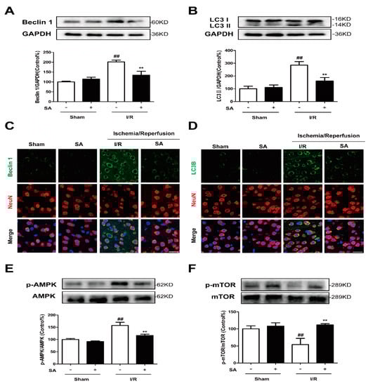SA Inhibits AMPK/mTOR Pathway and Autophagy Following Cerebral Ischemia/Reperfusion Injury in Mice. Mice were pretreated with SA and exposed to I/R. (A,B) The expression of Beclin 1 (A) and LC3 (B) was detected by Western blot (n = 3). (C,D) Then confocal microscope was used to detect Beclin 1/LC3B (green) and Neun (red). Bar: 20 µm. (E,F) The expression of phosphorylation of AMPK (E) and mTOR (F) was detected by Western blot (n = 3). All data are mean ± SD. ## P < 0.01 vs. Sham group; ** P < 0.01 vs. I/R group.