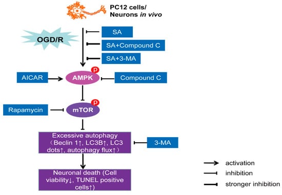 A proposed diagram tying together the observations involved in SA-induced neuroprotection against OGD/R injury. SA decreased phosphorylation of AMPK and increased phosphorylation of mTOR, which led to autophagy inhibition and neuroprotection against OGD/R injury in vivo and in vitro.