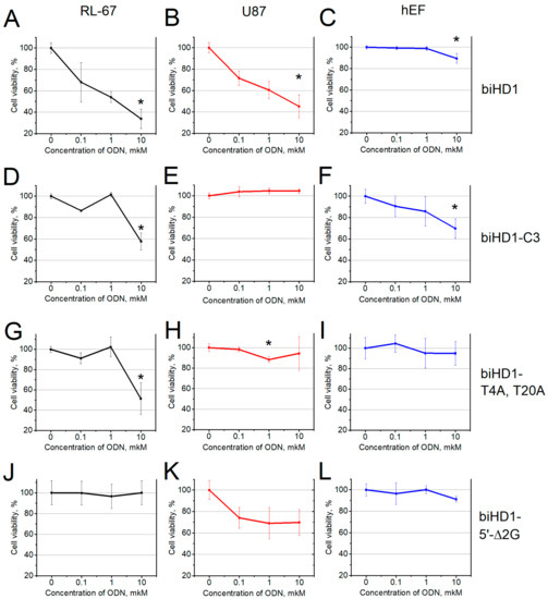 Cell viability according MTT test for oligonucleotides: (A–C)—biHD1; (D–F)—biHD1-C3; (G–I)—biHD1-T4A,T20A; (J–L)—biHD1-5′-Δ2G; results are presented for human cancer cell lines RL-67 (A,D,G,J), U87 (B,E,H,K), and embryonic fibroblasts (C,F,I,L) after 72 h incubation with different concentrations of oligonucleotides: Control experiment without oligonucleotides, 0.10, 1.0, and 10 μM. Data are presented as mean ± S.D. * marks p < 0.05 compared with control (w/o oligo).