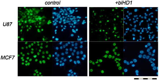 Antigen KI-67 (also known as Ki-67 or MKI67) is a nuclear protein that is strictly associated with cell proliferation, but is absent in resting (quiescent, G0) cells; and hence is a classical cellular marker for proliferation [32,33]. Ki-67 is an excellent marker to measure the growth fraction of a given cell population, identified by monoclonal antibody Ki-67. Even more, the fraction of Ki-67-positive tumor cells (the Ki-67 labeling index) is often correlated with the clinical course of cancer. Therefore, by comparing numbers of proliferating cells (stained with fluorescent Ki-67-antibody, green images) with a total number of cells (stained with bisbenzimide nuclear fluorescent dye, blue images) one could directly estimate an antiproliferative effect of biHD1.