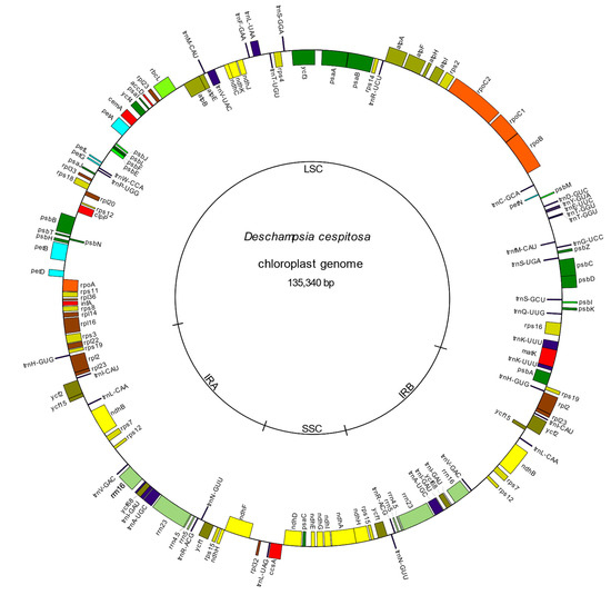 The cp genome of Deschampsia cespitosa resulted in a typical circular quadripartite structure of 135,340 bp length, with a LSC region of 79,992 bp, an SSC of 12,572 and two inverted repeats (IRa and IRb) each with a length of 21,388 bp. The average GC content was 38.27% (Table 1, Figure 1).