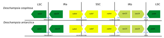 The cp genome of D. cespitosa contains 115 genes, including 81 protein-coding genes, four rRNA genes and 30 tRNA genes (Table S1). Twelve genes are duplicated in the IR and there are three open reading frames (ORF 188, ORF 56 and ORF 42). Gene order and size are nearly identical to those of D. antarctica. Both copies of the ndhH gene cross the boundaries between the regions: 34 bp in the IRa-SSC and 205 bp in the SSC-IRb (Figure 2). Of the 30 tRNA genes, 21 are located in the LSC, with trnT-GGU duplicated-. Furthermore, one gene is found in the SSC and the remaining eight are in the IRs. The four rNA genes are located in the inverted repeats, with two in each IR. Some functional groups are located in the LSC region, i.e., the small subunit of ribosome (rps genes, except rps15 in the SSC and rps7 and 12 in the IR), the large subunit (rpl genes except rpl32), the RNA polymerase (rpo genes), photosystems I (psa genes except psaC) and II (psb genes) and the cytochrome complex (pet genes). The NADH (nicotinamide adenine dinucleotide) dehydrogenase (ndh) genes are located in the SSC region, except for ndhB that is transpliced between the two IRs.