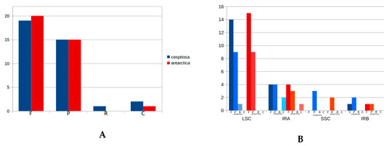 (A) Type of repeat sequences in plastid genomes of Deschampsia cespitosa and D. antarctica (F: forward; P: palindrome; R: reverse; C: complementary); (B) Location of repeat sequences in genomic regions of plastid genomes in Deschampsia cespitosa and D. antarctica (LSC: Long single- copy; SSC: Short single-copy; IRA: Inverted repeat A; IRB: Inverted repeat B).