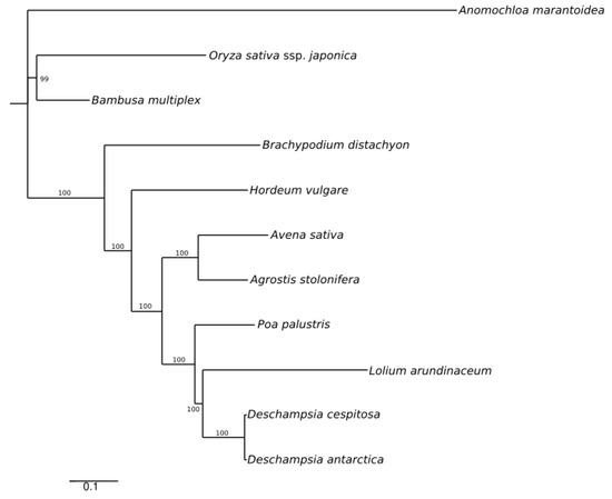 To verify the phylogenomic relationships of the newly obtained plastome of Deschampsia cespitosa in relation to other Poaceae, we selected early-diverging Poaceae and representatives of the BEP clade, especially members of the tribe Poeae ([7,39]; Agrostis stolonifera [12], Anomochloa maranthoidea [40], Avena sativa [41], Bambusa multiplex [42], Brachypodium distachyon [43], D. antarctica [6], Hordeum vulgare ssp. vulgare [12], Lolium arundinaceum [44], Oryza sativa ssp. japonica [11] and Poa palustris [41]) (Table S4). The data matrix was aligned with MAFFT [45] using standard settings. The alignment obtained with MAFFT was visually controlled with BioEdit [46]. The aligned matrix was uploaded in the IQ-TREE server [47] before a ML tree search with bootstrap support was run. The resulting tree (Figure 4) was edited with Inkscape [48].