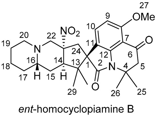 - Mercado-Marin, E.V.; Garcia-Reynaga, P.; Romminger, S.; Pimenta, E.F.; Romney, D.K.; Lodewyk, M.W.; Williams, D.E.; Andersen, R.J.; Miller, S.J.; Tantillo, D.J.; et al. Total synthesis and isolation of citrinalin and cyclopiamine congeners. Nature 2014, 509, 318–324. [Google Scholar] [CrossRef] [PubMed]