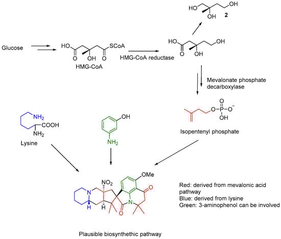 The possible of biosynthesis of citranilins and cyclopiamines have been studied using stable isotope (13C) labelling experiments to conclude glucose, anthranilic acid and ornithine as proposed precursors [6]. The present investigation led to the isolation of mevalonic acid derived compound 2-methylbutane-1,2,3-triol (2), suggesting that the prenyl group in 1 may be introduced from the catabolism of glucose through mevalonic pathway. Lysine instead ornithine was may be involved in the biosynthesis of the indolizidine component of 1, analogous to ornithine in clopiamine C. The clear observation of three units of isoprene and a lysine residue in the structure of 1 suggests that further investigation is needed to understand if an aminophenol related compound (apart from the reported anthranilic acid) may be involved in its biosynthesis (Figure 3).