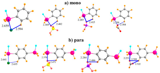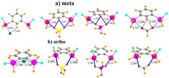 The two Sn atoms are close enough together in the ortho configuration that all anions can engage in a bidentate pair of tetrel bonds, as displayed in Figure 3b. This ability raises the binding energy of the Cl− by some 11 kcal/mol, and adds to the stability of the HCO2− complex. The Cl− and HSO4− anions go back to their original energetic ordering, now that both engage in a pair of tetrel bonds. The transition from meta to ortho allows shorter R(Sn··O) bond distances. It is interesting to observe that unlike the meta structure where the two Sn atoms come closer together to interact with the anion, the reverse occurs for the ortho arrangement. That is, the Sn atoms move further apart in order to make room for the anion, with R(Sn···Sn) elongations of some 0.3–0.5 Å, as detailed in Table 5. As a result, the deformations of the meta and ortho systems are comparable. In any case, the anion lies well above the aromatic plane of the Lewis acid.