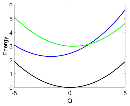 The mean values of the model parameters (1) are designated by an overbar and are selected as follows. The vibrational frequency is set to eV, which yields a vibrational period fs. The dimensionless shifts of the excited-state potential energy functions are fixed at and , the electronic energy difference eV, and the intra-state coupling is eV. The potential energy functions of the states and cross at (see Figure 1). The chromophore parameters are taken from a recent model describing the photophysics of the B and states of free-base tetraphenylporphyrin [30]. Obviously, SM signals depend on specific values of the model parameters. However, as we argue below, the qualitative behavior and interpretation of the signals of chromophores with nonadiabatic couplings is generic and model independent.