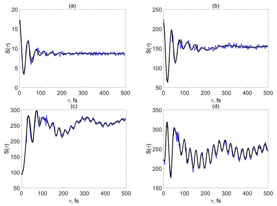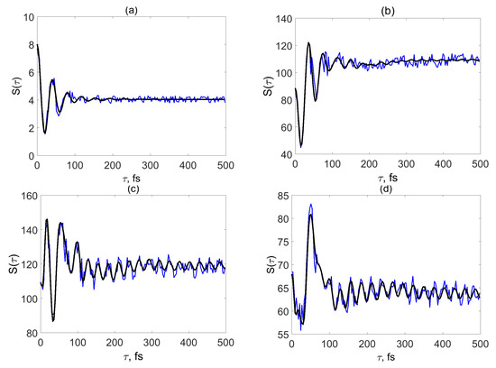 Figure 3b depicts the signal corresponding to turnover from the weak system-field coupling regime to the strong system-field coupling regime. The black line () shows low-amplitude beatings with a period fs for fs, which can hardly be distinguished when electronic energy modulations are taken into account (blue line). When the system-field coupling is further increased (Figure 3c,d), vibrational beatings gain amplitude and the effect of the energy gap modulation decreases, since the signal is dominated by the population contribution . The signals in Figure 3b–d have similar intensities, but the value of (which determines position the baseline in the figures) depends strongly on the system-field coupling . This is the signature of the regime of strong system-field coupling, in which the signal intensity is controlled by the Rabi frequency and exhibits an oscillatory dependence () on [12,34].