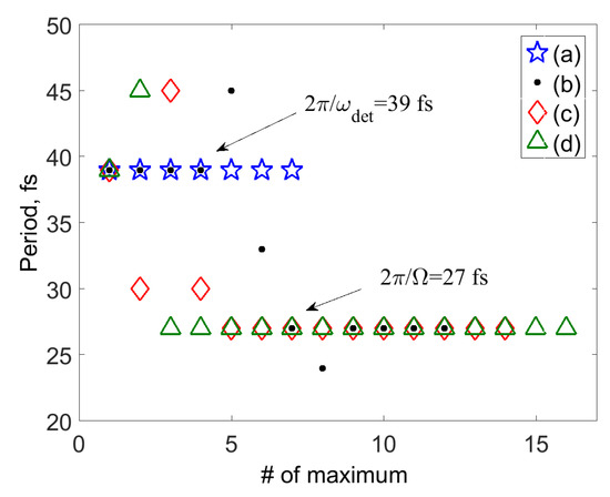 To follow more closely changes in the oscillatory features of with the system-field coupling, it is convenient to introduce the time moments corresponding to the local maxima of the SM signal. Figure 4 shows the distances between the local maxima, vs n for the signals of Figure 2a–d. corresponding to Figure 2a (blue stars) reveal exclusively oscillations with the detuning frequency, fs. As the system-field coupling increases, as a function of n can be decomposed into three domains. Domain 1 reveals oscillations with the detuning frequency, domain 2 is a transient region, and domain 3 reveals purely vibrational oscillations with a period of fs. As the system-field coupling increases (cf. circles, diamonds and triangles in Figure 4), domains 1 and 2 shrink, while domain 3 extends owing to the increasing role of the population contribution to the SM signal.