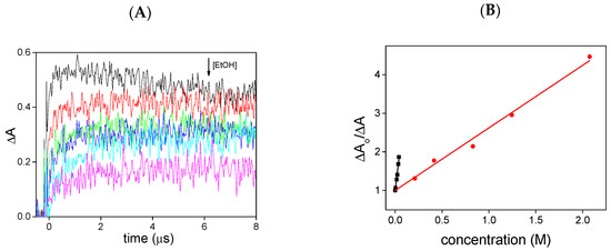 (A) Kinetic traces recorded at 390 nm after laser flash photolysis irradiation (λexc = 355 nm) of deaerated acetonitrile solutions of N-hydroxypyridine-2(1H)-thione (NPT) (0.29 mM) and trans-stilbene (TS) (7.5 mM) with increasing concentrations of ethanol (0–2.075 M); (B) Corresponding Stern–Volmer plots obtained as the ratio ΔAo/ΔAx versus Cx for Naph (0–0.05 M, black squares) and ethanol (0–2.075 M, red circles). (The values used in the case of Naph were taken from the graph of Scheme 1 bottom).