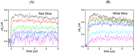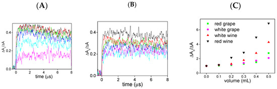 Kinetic traces recorded at 390 nm after laser flash photolysis irradiation (λexc = 355 nm) of deaerated acetonitrile solutions of NPT (0.29 mM) and TS (7.5 mM) with increasing volumes of freshly squeezed juice (0–0.5 mL): commercial red grapes of Monastrell variety (A), commercial white grapes of Rosseti variety (B). (C) Corresponding Stern–Volmer plots.