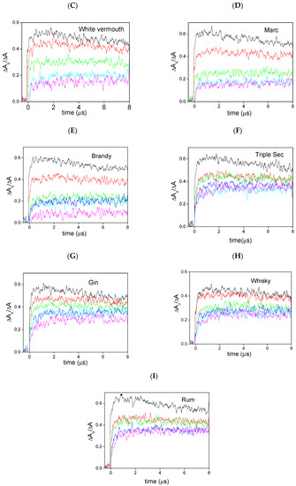 Kinetic traces recorded at 390 nm after laser flash photolysis irradiation (λexc = 355 nm) of deaerated acetonitrile solutions of NPT (0.29 mM) and TS (7.5 mM) with increasing volumes of beverages (0–0.5 mL): red wine (A), white wine (B), white vermouth (C), marc (D), brandy (E), triple sec (F), gin (G), whisky (H), and rum (I).