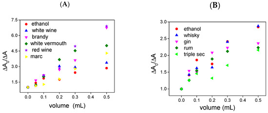 Stern–Volmer-like plots obtained as the ratio ΔAo/ΔAx versus added volume of the different beverages (values taken from Figure 2). (A) drinks derived from grapes; (B) distillates non-derived from grapes.