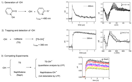 The hydroxyl radical was cleanly obtained from the homolytic rupture of N-hydroxypyridine-2(1H)-thione (NPT) upon laser flash photolysis at 355 nm. As a result of this homolytic rupture, the “invisible” hydroxyl radical is generated together with the unreactive pyrithiyl radical that has an absorption maximum at 490 nm, and therefore provides evidence for the process (Scheme 1 top). To reveal the hydroxyl radical, trans-stilbene (TS) was used as a trap giving rise to a detectable adduct (TS-OH•) with a characteristic transient absorption band with maximum at ca. 390 nm (Scheme 1 middle).
