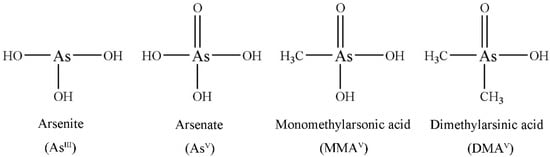 Arsenic (As) can be converted into different chemical forms or species upon entering the body, including inorganic arsenic [arsenite (AsIII), arsenate (AsV)] and organic forms [monomethylarsonic acid (MMAV), dimethylarsinic acid (DMAV), arsenobetaine (AsB), arsenocholine (AsC) and so on]. It is widely acknowledged that the toxicological and biochemical properties of trace elements depend to a large extent on species. Inorganic arsenic is more toxic than the organic counterpart, while AsB, AsC and other arsenosugars are considered to be non-toxic [16]. Arsenite has a direct affinity to the sulfhydryl group, inducing structural modifications in proteins and enzyme inactivation [17,18]. Arsenate is similar to phosphate in biochemical properties, and can impair ATP synthesis [19]. MMAV is an intermediate metabolite of arsenic metabolism, with certain toxicity [20]. DMAV is the predominant methylated metabolite, which is considered a tumor promoter [21,22,23]. Therefore, there are high concerns about AsIII, AsV, MMAV and DMAV (Figure 1) in clinical studies.