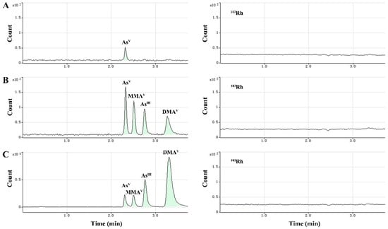 Typical chromatograms showing baseline separation of As species, including AsV (retention time (RT) = 2.30 min), MMAV (RT = 2.51 min), AsIII (RT = 2.77 min) and DMAV (RT = 3.32 min), and Rh internal standard (right-side chromatograms). (A) Blank plasma sample, (B) blank plasma sample spiked with the analytes at the lower limit of quantitation (LLOQ), (C) cynomolgus macaque plasma sample after dosing of arsenic trioxide solution.