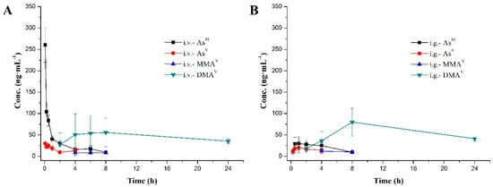 Mean plasma concentration-time curves of the four arsenic species after administration (A. intravenous; B. intragastrical) at a single dose of 0.80 mg·kg−1 (0.61 mg·kg−1 of arsenic). Data are mean ± SD (n = 10).
