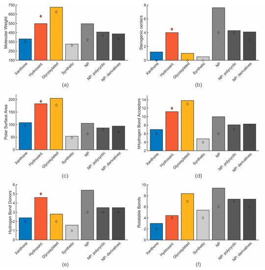 Mean (bar) and median (diamond) values of MW (a), stereogenic centers (b), PSA (c), HBA (d), HBD (e), rotatable bond (f) for marine xanthone derivatives (blue), hydroxanthone derivatives (orange), glycosylated derivatives (yellow), marketed drug types accordingly to its origin (greys).