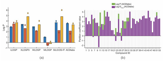 (a) Mean (bars) and median (diamonds) log P values of each category of marine xanthone derivatives calculated by different methods. (b) Difference between log P and log D7.4 calculated using ACDlabs.