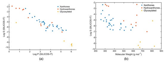 (a) Log S (SILICOS-IT) of the marine xanthone derivatives vs molecular weight. (b) Log S (SILICOS-IT) of the marine xanthone derivatives vs Log P (SILICOS-IT).