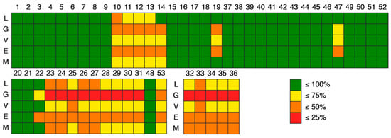 Colormap of the compliance with rules of drug-likeness: L—Lipinski, G—Ghose, V—Veber, E—Egan, M—Muegge. Xanthone derivatives (ID: 1–19, 37–47, 49–52) are represented on the upper quadrant, hydroxanthone derivatives (ID: 20–31, 48, 53) on the lower left and glycosylated derivatives (ID: 32–36) on the middle. Green means ≤100% of compliance, yellow means ≤75% of compliance, orange means ≤50% of compliance, and red means ≤25% of compliance.