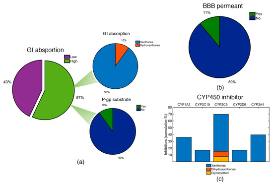 (a) GI absorption for the identified marine xanthone derivatives (left pie chart). Marine xanthone derivatives with high GI absorption were classified accordingly to its category (upper pie chart) and as P-gp substrate (lower pie chart). (b) BBB permeability of the identified xanthone derivatives. (c) Cumulative percentage of compounds identified as inhibitors of the five major isoforms of CYP450.