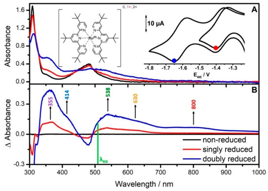 Electronic absorption spectra of [Ru(tbtpy)2]2+ were measured at the first and second reduction potential (Figure 1A, red and blue spectra). For a better visualization of the spectral changes during the two reduction steps, difference spectra were calculated (Figure 1B). The absorption spectrum recorded during cycling a slow voltammogram of [Ru(tbtpy)2]2+ in the potential range of −1.20 and −1.50 V (scan rate of 5 mVs−1) is shown in Figure 1A. The decrease of the MLCT absorption band at 481 nm is accompanied by the growth of new absorption features between 334 and 434 nm as well as between 490 and 700 nm peaking at 355, 538, and 630 nm (Figure 1 and Figure 2B, red graph). The new band at 630 nm has been assigned to a ligand centered transition of the one electron reduced radical form of the tpy ligand [14,30]. In agreement with previous studies, a very weak and broad absorption band in the NIR is observed upon reduction [13,39]. The observed spectral changes increase with increasing reduction potential—in particular, the shoulders at 414 and 630 nm and the broad band around 800 nm become significantly more pronounced during the second reduction in comparison to the first reduction of [Ru(tbtpy)2]2+ (Figure 1).