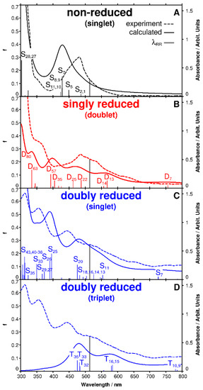The RR spectra were calculated within the independent mode displaced harmonic oscillator model (IMDHOM). Detailed information with respect to the simulation of RR intensities within the IMDHOM can be found in References [51] and [52] as well as in the references therein. RR intensities have been calculated for the non-reduced complex using the S1, S2, S5, S7, S8, S9, S10, and S11 states, whereas the S1, S2, and S5 states have been red-shifted by 2500 cm−1. For the singly reduced system the D13, D20, and D25 states have been used, while the excitation energy of all three states were bathochromically shifted by 1500 cm−1. In order to simulate the RR intensity pattern of the doubly reduced species, the calculations were performed within singlet and triplet multiplicity. Thus, in case of the doubly reduced singlet the states S11, S13, S14, S16, S18, S20, S25, and S26 were used, while no correction to the vertical excitation energies was applied. The RR intensity pattern within triplet multiplicity was obtained taking into account contributions from the states T15, T16, T32, T33, and T35; all respective excitation energies were red-shifted by 700 cm−1.