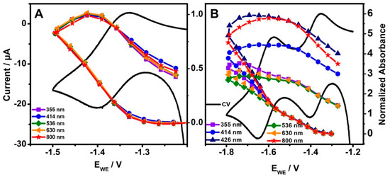 To assign the spectral changes specifically to the singly and doubly reduced complex, a normalized absorbance Absnorm = Abs(EWE) − Abs(ocp)/Abs(1st reduction) has been calculated and plotted at 355, 414, 426, 536, 630, and 800 nm as a function of the reductive potential (Figure 3). First, by subtraction of the absorbance at ocp, the difference spectrum is calculated focusing on spectral changes. By normalization to the absorbance at the first reduction potential, Absnorm measures the concentration of the singly reduced complex according to Beer-Lambert’s law. Hence, within the first reduction potential range, Absnorm resembles the CV and the formation of the singly reduced complex and is identical, i.e., non-dispersive, for all wavelengths (Figure 3A). When increasing the reductive potential further, Absnorm becomes dispersive (Figure 3B). Large changes in Absnorm indicate strong absorption of the doubly reduced complex, particularly at 414, 426, and 800 nm. That proves, that by increasing reductive potential (i) the concentration of singly reduced complex increases and additionally that (ii) the doubly reduced form is generated, which is characterized by absorption features at 414, 426, and 800 nm.
