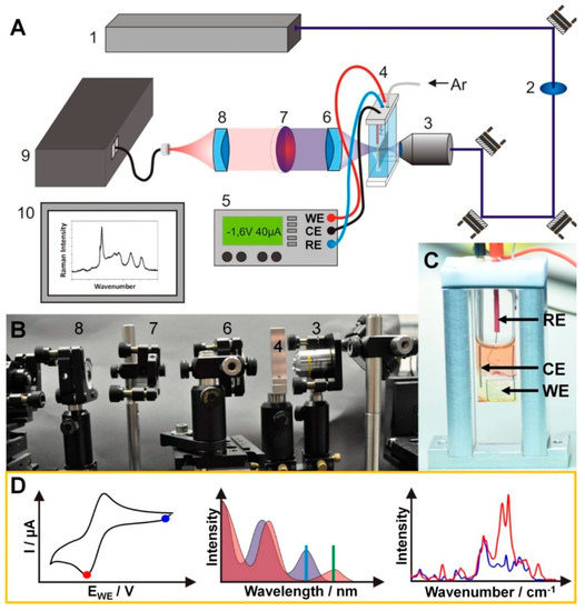 The in-situ UV-vis-SEC measurements were performed at ambient temperature using a double UV-vis-NIR spectrometers beam (Cary 5000 UV/Vis spectrometer, Agilent, Santa Clara, CA, USA) with 1 nm spectral resolution and a Fiber Optic AvaSpec ULS2048XL spectrometer (Avantes, Apeldoorn, Veluwe, The Netherlands) with a charged coupled device (CCD, SPEC-10, Roper Scientific, Acton, MA, USA) detector in the wavelength range between 200 and 1100 nm. The RR spectra were excited by the visible lines of an Argon ion laser (Coherent, Innova 300C, Santa Clara, CA, USA) and recorded with an Acton SpectraPro 2758i spectrometer (entrance slit width 100 µm, focal length 750 mm, grating 1800/mm, Acton, MA, USA). A general scheme of the RR-setup is depicted in Figure 5. Measurements were performed in transmission. The Ar-ion laser was spectrally cleaned from plasma lines by a filter (2) before being focused into a 1 mm path length SEC cell (Figure 5B). The cell was customized for oxygen-free operation (Figure 5C). It was filled under inert conditions in a glove box and sealed with a Teflon cap. The cell was then placed in the beam path and the laser focused onto the Pt-grid working electrode by a 10× microscope objective (Plan-Achromat, Olympus, Japan) (3), while the potential at the working electrode was controlled by a potentiostat (5). The scattered light was collimated by a lens (6), and filtered from lasers and Rayleigh-scattered light by a long pass filter (7) before being focused onto a linear collection fiber bundle and transmitted to the spectrograph (9), while the data was subsequently analyzed on a computer.