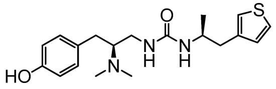 1-((S)-2-(Dimethylamino)-3-(naphthalen-2-yl)propyl)-3-((S)-1-(thiophen-3-yl)propan-2-yl)urea (7b): 1H-NMR δH (400MHz, DMSO-d6, ppm): 0.91–0.92 (d, J = 6.44Hz, 3H, CH-CH3), 2.30 (s, 6H, N-CH3), 2.54–2.67 (m, 2H, Ar-CH2thiophene), 2.75–2.89 (m, 2H, Ar-CH2), 2.98–3.10 (m, 2H, CH2-NH), 3.38–3.41 (m, 1H, CH-N), 3.67–3.73 (m, 1H, NH-CH), 5.63–5.65 (d, J = 5.04Hz, 1H, NH-CO), 6.00–6.02 (d, J = 7.84Hz, 1H, NH-CO), 6.90–6.91 (dd, J = 1.12, 4.76Hz, 1H, HAr), 7.09 (d, J = 1.68Hz, 1H, HAr), 7.36–7.40 (m, 2H, HAr), 7.50–7.61 (m, 2H, HAr), 7.70 (s, 1H, HAr), 7.83–7.88 (m, 3H, HAr). MS-HR (ESI) m/z: 396.2104 [M + H].
