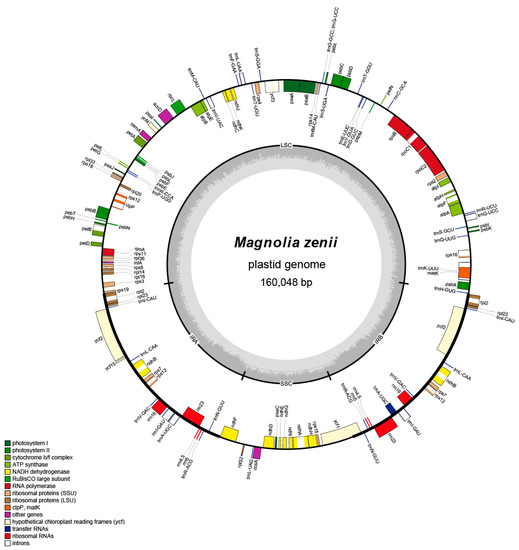 The full-length plastome of M. zenii was 160,048 bp, which is slightly larger than that of the closely-related species Magnolia biondii Pamp. (160,002 bp) (Table S1). The plastome length in other species of Magnolia ranges narrowly from 158,177 bp in Magnolia liliiflora Desr. to 160,183 bp in Magnolia officinalis Rehder & E.H. Wilson (Table S1) [29]. The plastid structure of M. zenii was a typical quadripartite circular molecule (Figure 1) that resembles the plastomes of the majority of angiosperms, which includes a large single-copy (LSC) region of 88,098 bp and a short single-copy (SSC) region of 18,757 bp divided into a pair of inverted repeat (IR) regions, IRA (26,596 bp) and IRB (26,596 bp) (Figure 1 and Table S1).