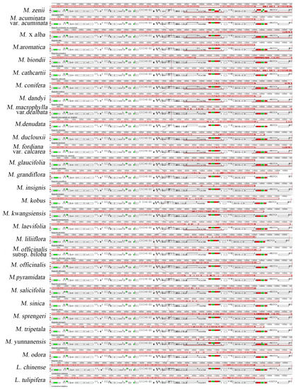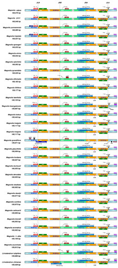The plastid genome (or “plastome”) of all angiosperms has a quadripartite structure consisting of a large single-copy (LSC) region, a small single-copy (SSC) region, and two copies of larger inverted repeats (IRs) [23]. While often referred to as the “chloroplast genome”, chloroplasts are just one type of plastid, along with leucoplasts, chromoplasts, and amyloplasts, which all develop from proplastids of an embryo and have an identical genome. The plastome varies in size from 75–250 kb and is highly conserved in terms of gene order and genome organization in flowering plants [24]. Hence, plastome sequences are widely used for exploring phylogenetic relationships in different plant groups [25,26]. However, some structural rearrangements have been discovered, such as gene or intron loss, and large inverted repeat (IR) expression [27,28]. Comparative analysis of plastomes can, thus, provide greater insight into the evolutionary history and interspecies relationships in the genus Magnolia.