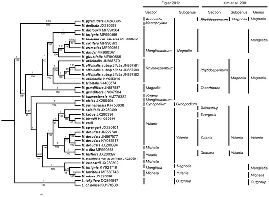 BI phylogenomic tree of 28 Magnolia (represented by 36 individuals) and 2 Liriodendron species. Numbers above the lines indicate the posterior probability of each clade, and numbers below the lines indicate the likelihood bootstrap values. The vertical lines on the right of the phylogenomic tree show the subgeneric taxonomic placement of these species according to Kim et al. [21] and Figlar [64].