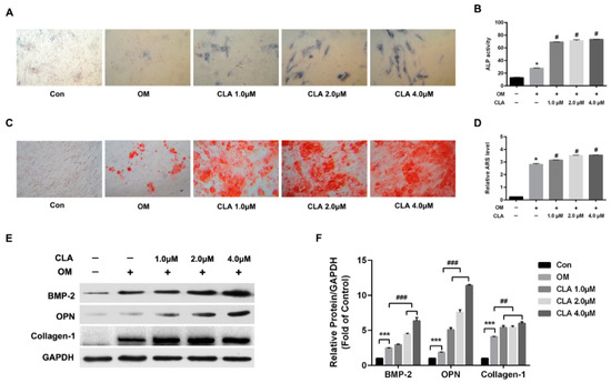 CLA promoted osteoblast differentiation in hBMSCs. hBMSCs (Con) were induced for osteoblast differentiation for 15 d, without (OM) or with different concentrations of CLA (CLA). (A) Cellular ALP activity (blue) detected using ALP activity staining kit (100×); (B) quantitative analysis of ALP activity; (C) extracellular calcium deposits (red) detected by alizarin red S (ARS) staining (100×); (D) quantitative analysis for calcium-combined ARS; (E) osteoblast-specific proteins detected by Western blotting; (F) protein expression levels normalized to GAPDH. Data are expressed as mean ± SD (n = 3). Compared to Con, data were significantly different at * p < 0.05 and *** p < 0.001; compared to OM, data were significantly different at # p < 0.05, ## p < 0.01, ### p < 0.001.
