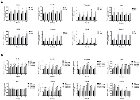 mRNA expression of Wnt/β-catenin signaling pathway-related genes in differentiating hBMSCs. hBMSCs were maintained in growth medium (Con), or induced for osteogenic differentiation for 1, 3, 6, 9, or 15 d respectively, in the absence (OM) or presence of CLA (CLA). mRNA levels of respective genes were measured by RT-qPCR and normalized to GAPDH. (A) Comparison of mRNA expression levels of respective genes in Con and OM. (B) Comparison of mRNA levels of respective genes in OM and CLA. Data were expressed as mean ± SD (n = 3). Compared to Con, data were significantly different at * p < 0.05; compared to OM, data were significantly different at # p < 0.05.