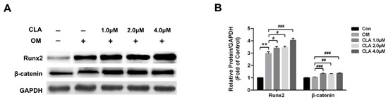 Expression of Runx2 and β-catenin in hBMSCs. Cells were maintained in growth medium, or induced for osteoblast differentiation in the presence or absence of different concentrations of CLA for 15 d. (A) Protein expression detected by Western blotting; (B) Quantitative analysis for protein expression. Compared to Con, data were significantly different at ** p < 0.01; compared to OM, data were significantly different at # p < 0.05, ## p < 0.01, ### p < 0.001.