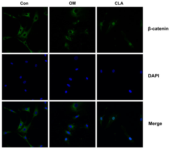 Confocal imaging for cellular β-catenin (100×). hBMSCs were maintained in growth medium (Con), or induced for osteoblast differentiation in the absence (OM) or presence of 1 µM CLA (CLA) for 48 h. Cellular β-catenin (green) was detected by immunofluorescence staining, with the nuclei stained with DAPI (blue). In Con, β-catenin expressed mainly in cytosol. In CLA, β-catenin expressed mainly in nucleus.