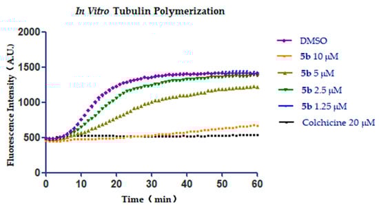 Effect of 5b on tubulin polymerization in vitro. Purified tubulin protein at 2 mg/mL in a reaction buffer was incubated at 37 °C in the presence of 1% dimethyl sulfoxide (DMSO), test compound 5b at 1.25, 2.5, 5, or 10 μM or colchicine at 20 μM. The fluorescence intensity was measured every 60 s for 60 min and is presented as increases in the polymerized microtubule.