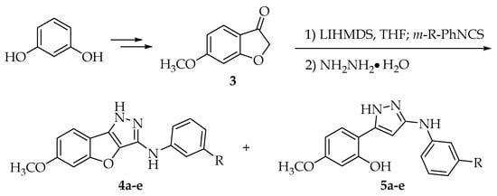 The synthetic route towards the benzofuropyrazole derivatives was shown in Scheme 1. The 6-methoxybenzofuran-3-(2H)-one 3 was prepared according to the reported method in three steps [,,] (please refer to the Supplementary Materials). The Hoesch reaction of resorcinol with chloroacetonitrile in the presence of anhydrous ZnCl2 and HCl gas generated an imine intermediate, which upon hydrolysis, provided 2-chloro-1-(2,4-dihydroxyphenyl)ethanone in 94% yield. Treatment of the chloromethyl ketone with a mild base, CH3COONa, gave the cyclized 6-hydroxybenzofuran-3-(2H)-one (54%). Methylation of 6-hydroxybenzofuran-3-(2H)-one with Me2SO4 produced the 6-methoxybenzofuran-3-(2H)-one 3 in 86% yield. After the deprotonation of the α-proton of carbonyls in 3 with lithium hexamethyldisilazide (LiHMDS), the resulting enolates were reacted with 3-substitued phenyl isothiocyanates to give the thioamide intermediates, which underwent condensation with hydrazine monohydrate in dioxane/EtOH (1:1) to form the benzofuropyrazole derivatives 4a–e in 11% to 30% yield. In this process, the partial cleavage of the furan ring occurred, a series of 5-methoxy-2-(3-(phenylamino)-1H-pyrazol-5-yl)phenol derivatives 5a–e were also isolated in 13% to 31% yield. The structures of benzofuropyrazoles 4a–e and pyrazoles 5a–e were determined by 1H nuclear magnetic resonance (NMR), 13C-NMR and electrospray ionization mass spectrometry (ESI-MS). In the 1H NMR spectrum of benzofuropyrazole 4c, the pyrazole 1-NH appeared at 11.91 ppm, the aniline NH at 8.05 as a singlet, the amide NH at 8.28 (q, J = 4.6 Hz) in corresponding with the N-methyl at 2.77 (d, J = 4.6 Hz). The seven protons at the two phenyl rings appeared at 6.42 to 7.82 ppm. In comparison with 4c, in the 1H NMR spectrum of pyrazole 5c, there were two additional peaks at 10.23 ppm for the phenol OH, 6.24 ppm for the pyrazole 4-H, supporting its estimated structure.