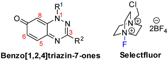 The remarkable expansion in the use of fluorinated chemicals has attracted the attention of organic, agricultural, medicinal, and materials scientists. Uniquely, the incorporation of fluorine atoms into organic molecules introduces polar hydrophobicity. This has been significantly utilized in medicinal chemistry as a means to increase efficacy [1,2], with some 30% of blockbuster drugs containing fluorine atoms [3]. Selectfluor is perhaps the most versatile, stable, cheap, and effective commercial electrophilic fluorinating reagent [4], and in this article, we demonstrate its use in the selective fluorination of some 7-oxo-1,2,4-benzotriazines (benzo[1,2,4]triazin-7-ones) (Figure 1). Selectfluor is also a strong oxidant, and mediator or catalyst of several “fluorine-free” transformations [5]. Selectfluor is known to directly substitute fluorine into activated positions on anilines, benzamides, and phenols [6,7]; however, to date, examples of fluorinated quinones are few and low-yielding (<20%) [8,9]. Typically, in such cases, the fluorine was introduced via a halogen exchange with nucleophilic fluoride reagents, such as KF [10,11,12]. Interestingly, 2-hydroxymethylindole can undergo simultaneous electrophilic aromatic substitution with fluorine at the activated enamine C-3 position with oxidation of the alcohol to the aldehyde by using Selectfluor [13].