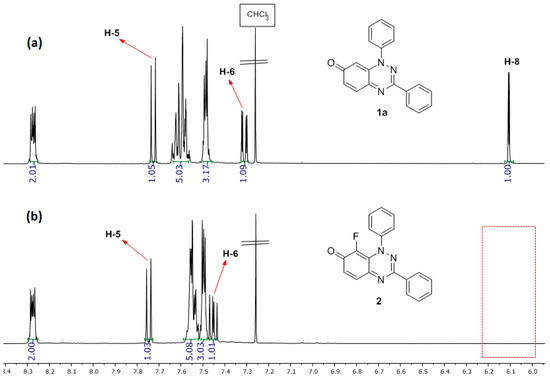 1H-NMR spectrum: (a) of 1,3-diphenylbenzo[e][1,2,4]triazin-7(1H)-one (1a) and (b) of 8-fluoro-1,3-diphenylbenzo[e][1,2,4]triazin-7(1H)-one (2).