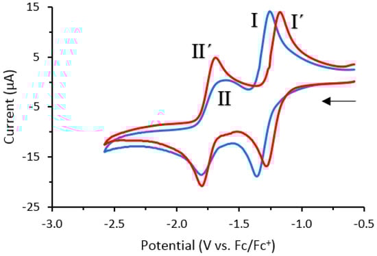Cyclic voltammograms of 1a (blue line) and 2 (red line) recorded in CH2Cl2 (0.1 M n-Bu4NPF6) at a glassy carbon electrode (scan rate: 0.1 V·s−1). Arrow indicates the direction of the scan.