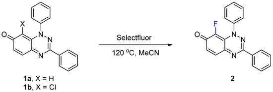 Selectfluor was found to fluorinate at the 8-position of the parent 1,3-diphenylbenzo[e][1,2,4]triazin-7(1H)-one (1a), presumably due to enamine conjugation with the N-1 atom (Scheme 1). Initially, low yields of 8-fluoro derivative 2 were obtained, when using less than 2 equivalents of Selectfluor at room temperature and at reflux in acetonitrile, with recovery of 1a (Table 1). The complete conversion of 1a to 2 was observed by TLC after 1 h when increasing the reaction temperature to 120 °C, which was facilitated by using a sealed Ace pressure tube with 2 isolated in 94% yield after column chromatography. The reaction time was reduced to 20 min when performing the transformation in a microwave reactor (150 W, 7 bar), with 2 isolated at 97% yield. Applying the latter optimized conditions on 8-chloro-1,3-diphenylbenzo[e][1,2,4]triazin-7(1H)-one (1b), a halogen exchange proceeds efficiently yielding 2 in 96% yield, although after a longer reaction time of 1 h, as monitored by TLC. Jiang et al. [13] reported a similar aromatic substitution of bromine by fluorine at the C-3 position of indole, using Selectfluor. In these cases, the defluorinated Selectfluor by-product (1-chloromethyl-1,4-diazobicyclo[2.2.2]octane) may assist with the elimination of the halogen atom.