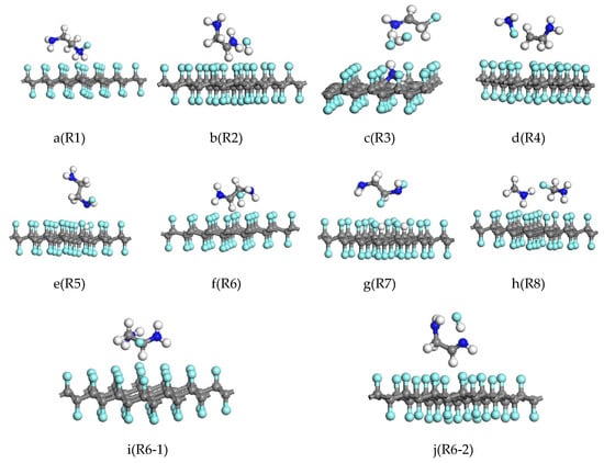 Yokozeki [26] reported that the structure of EDA is mainly based on the gauche type. Firstly, the reaction of CF and EDA in the gauche structure was studied. The reaction R1 involves the attack of the F atom by the H atom in the NH2. After the reaction, the F atom is reduced and an N–F bond is formed that has a bond length of 1.427 Å. The structural formula of the EDA molecule becomes H2NH2C–CHNH2F, as shown in Figure 2a. In reaction R2, the H atom in the CH2 of EDA attacks the surface of the CF. After the reaction, one H atom on the C atom of EDA and one F atom on fluorinated graphene form an H–F bond. Meanwhile, the structural formula of EDA becomes H2NH2C–CHNH2, as shown in Figure 2b. There are two reaction paths, R3 and R4, when the surface of the CF is attacked simultaneously with H atoms in NH2 and CH2. The reaction results are shown in Figure 2c,d, respectively. In reaction R3, the EDA molecule is broken into NH2 and CH2CH2NH2. The NH2 is decomposed into NH and H on the surface of the fluorinated graphene. The H atom replaces one F atom, and the NH replaces two F atoms. The N atom in the NH forms a C–N bond with two C atoms, one F atom forms an H–F bond with the H atom on the carbon in CH2CH2NH2, and the other two F atoms are bonded to the H atom and the F atom on CH2CHNH2, respectively, to become FH2NHC–CH2F. After the end of the reaction, the CF surface is distorted and N atoms are present, which is in agreement with the experimental results of Hou and Ma [23,37]. The C–N bond formed in reaction R4 is also cleaved. During the reaction, one F atom is reduced from the CF bonds with the N atom of NH2 to become NH2F and H2C–CH2NH2.