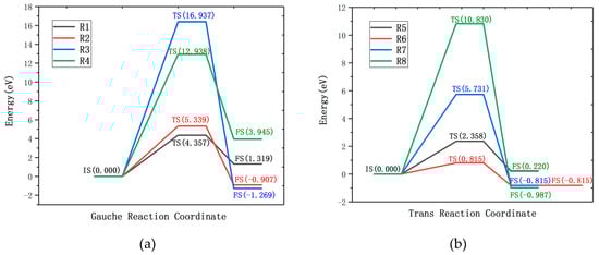 Reaction energy profiles of the R1–R4 reaction paths (a) and the R5–R8 reaction paths (b), Where the IS, TS and FS represent the initial state, transition state and final state, respectively.