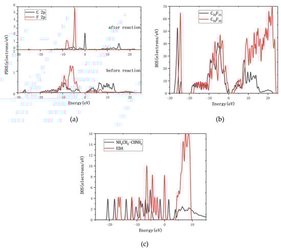 The density of states (DOS) reflects the number of states of the unit energy, which is important in further understanding the reaction between EDA and CF. The interactions between C and F atoms on graphene fluoride before and after the reaction were analyzed. Partial densities of states (PDOS) of C and F are shown in Figure 4a. Due to the existence of the C–F bond, the 2p orbit of the C atom and the 2p orbit of the F atom have overlapping peaks at −9.2 eV before reaction. After the reaction of R6, there is no overlapping peak between the 2p orbit of the C atom and the 2p orbit of the F atom, which means the C–F bond is broken. This result is consistent with the reaction phenomena. The EDA and the CF DOS diagram before and after reaction are analyzed further, as shown in Figure 4b,c. After the R6 reaction, the DOS diagram has been changed obviously: the CF and the EDA DOS diagram have moved to the left. It means that the system becomes more stable when the reaction is completed. The product of R6, C32F31, has conductivity according to the DOS of Figure 4b. With the decrease of F atoms in CF, the conductivity of the system is increased, which is consist with the experimental result of Lee [39].